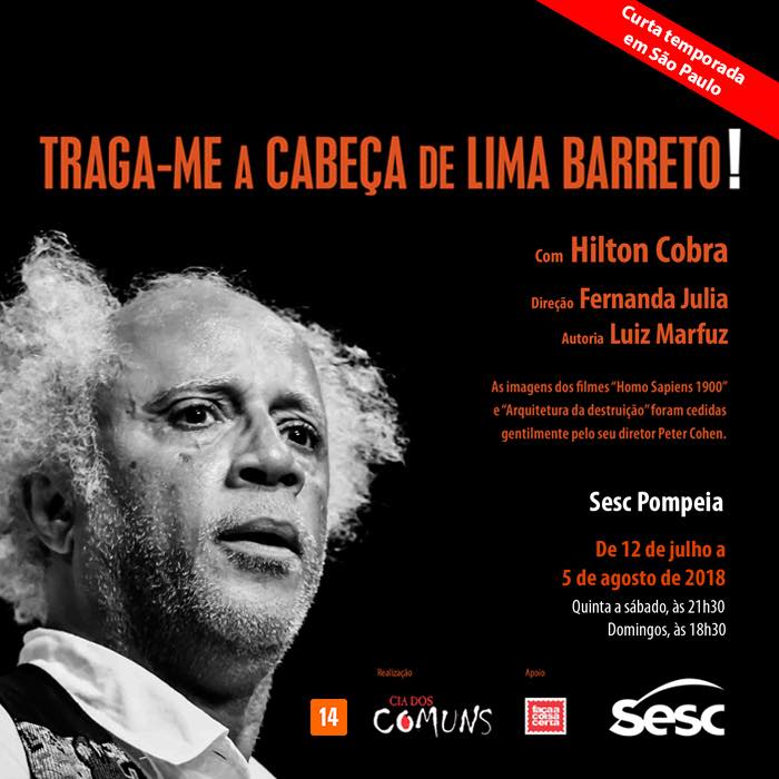 COM HILTON COBRA - CIA. DOS COMUNS (RJ) Últimas semanas Inspirado livremente na obra de Lima Barreto, o monólogo reúne trechos de memórias impressas em suas obras, entrecruzadas com livre imaginação. O texto fictício tem início logo após a morte de Lima Barreto, quando eugenistas exigem a exumação do seu cadáver para uma autópsia, a fim de esclarecer "como um cérebro inferior poderia ter produzido tantas obras literárias – romances, crônicas, contos, ensaios e outros alfarrábios – se o privilégio da arte nobre e da boa escrita é das raças superiores?". A partir desse embate com os eugenistas, a peça mostra as várias facetas da personalidade e da genialidade de Lima Barreto, sua vida, família, a loucura, o alcoolismo, sua convivência com a pobreza, sua obra não reconhecida, racismo, suas lembranças e tristezas. Dramaturgia: Luiz Marfuz Direção: Fernanda Júlia Direção de Movimentos: Zebrin...